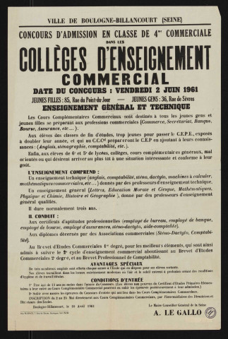 Concours d'admission en classe de 4me commerciale dans les collèges d'enseignement commercial,