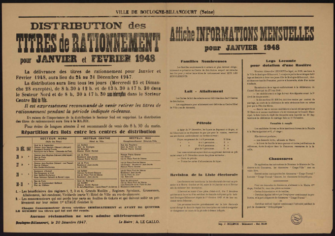 Distribution des titres de rationnement pour janvier et février 1948 ; informations mensuelles pour janvier 1948,