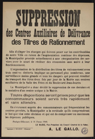 Suppression des centres auxiliaires de délivrance des titres de rationnement,