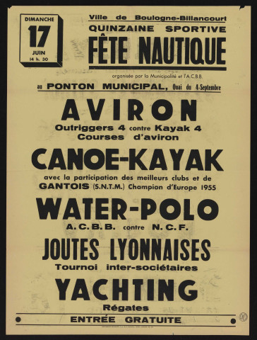 Quinzaine sportive, fête nautique au ponton municipal, quai du 4-Septembre : aviron, canoë-kayak, water-polo, joutes lyonnaises, yachting, Deux affiches, une orange, une jaune.