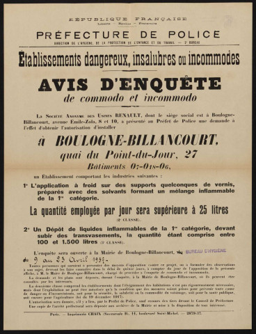 Avis d'enquête de commodo et incommodo : 27 quai du Point-du-Jour (bâtiments O7, O18, O6), Société anonyme des Usines Renault : application à froid sur des supports quelconques de vernis, préparés avec des solvants formant un mélange inflammable de la 1re catégorie ; un dépôt de liquides inflammables de la 1re catégorie.