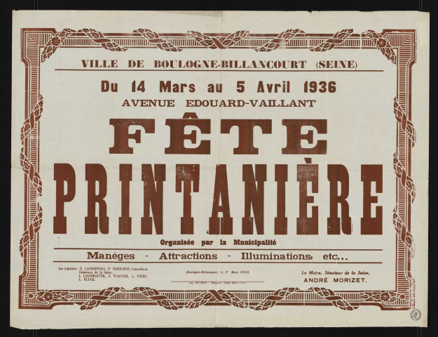 Fête printanière de Billancourt organisée par la municipalité du 14 mars au 5 avril 1936 avenue Edouard-Vaillant,