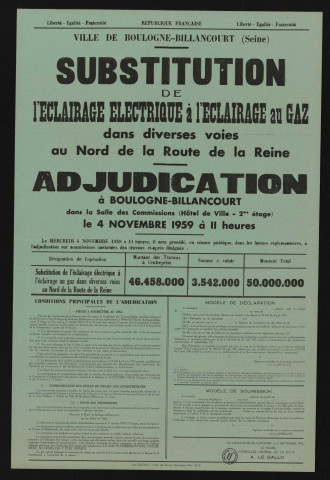 Substitution de l'éclairage électrique à l'éclairage au gaz dans diverses voies au Nord de la Route de la Reine : adjudication,
