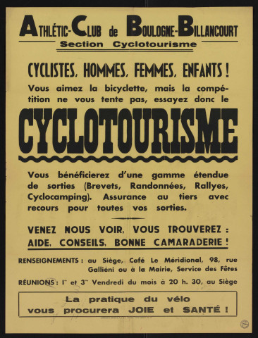 Cyclistes, hommes, femmes, enfants ! Vous aimez la bicyclette, mais la compétition ne vous tente pas, essayez donc le cyclotourisme,
