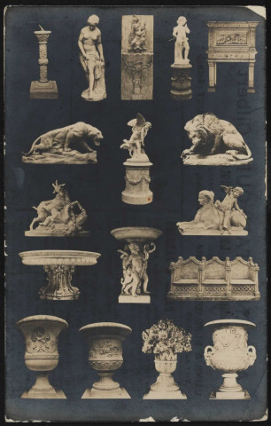 Au dos de cette carte, quelques sijets pris dans notre importante collection de vases, statues, bancs, colonnades, gaines, etc...
