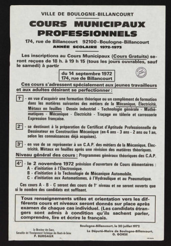 Cours municipaux professionnels, année scolaire 1972-1973,