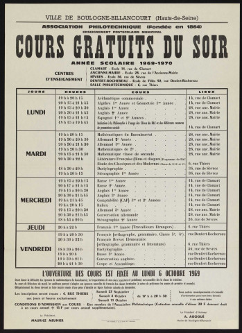 Cours gratuits du soir, année scolaire 1969-1970 ,