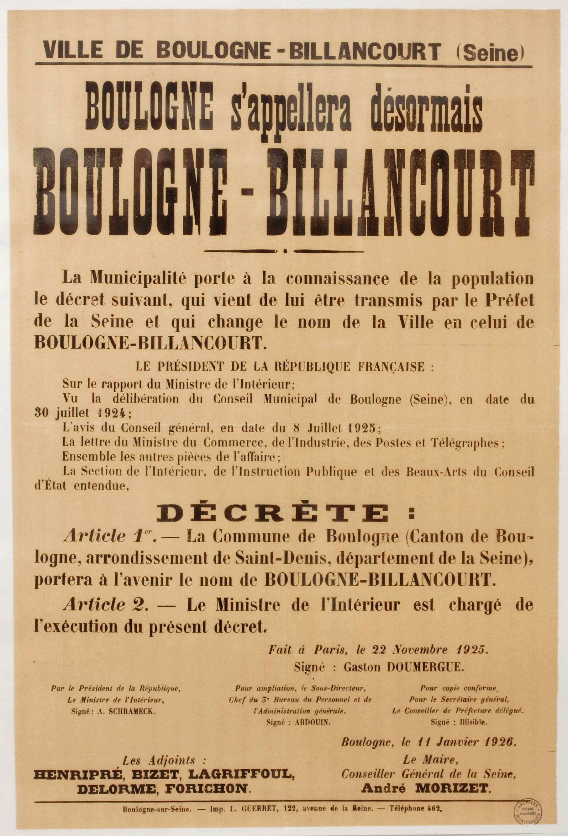 Affiche "Boulogne s'appellera désormais Boulogne-Billancourt" (1926)